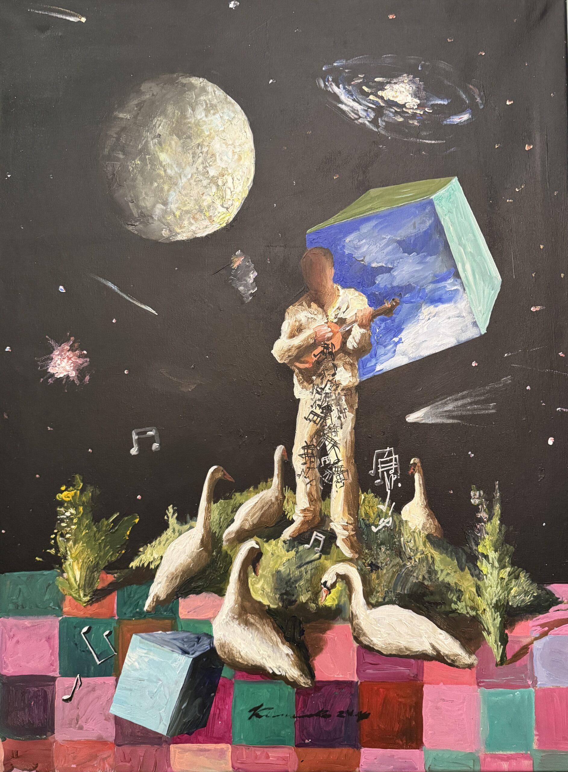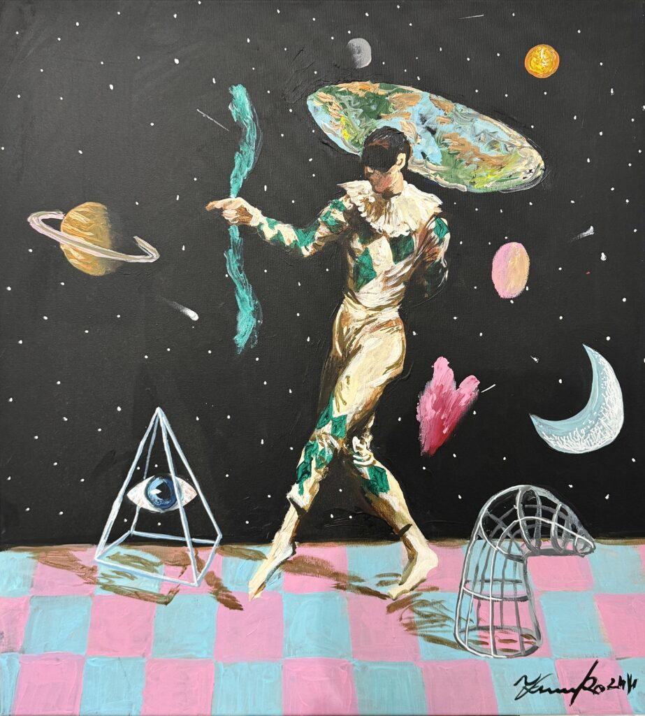 Der Kosmos erscheint hier nicht als astronomischer Raum, sondern als Metapher für unbegrenztes kreatives Potenzial. Planeten, architektonische Strukturen, Gerüste und Bühnenfragmente bilden eine Bildsprache, in der der Mensch nicht Beobachter, sondern Schöpfer ist.